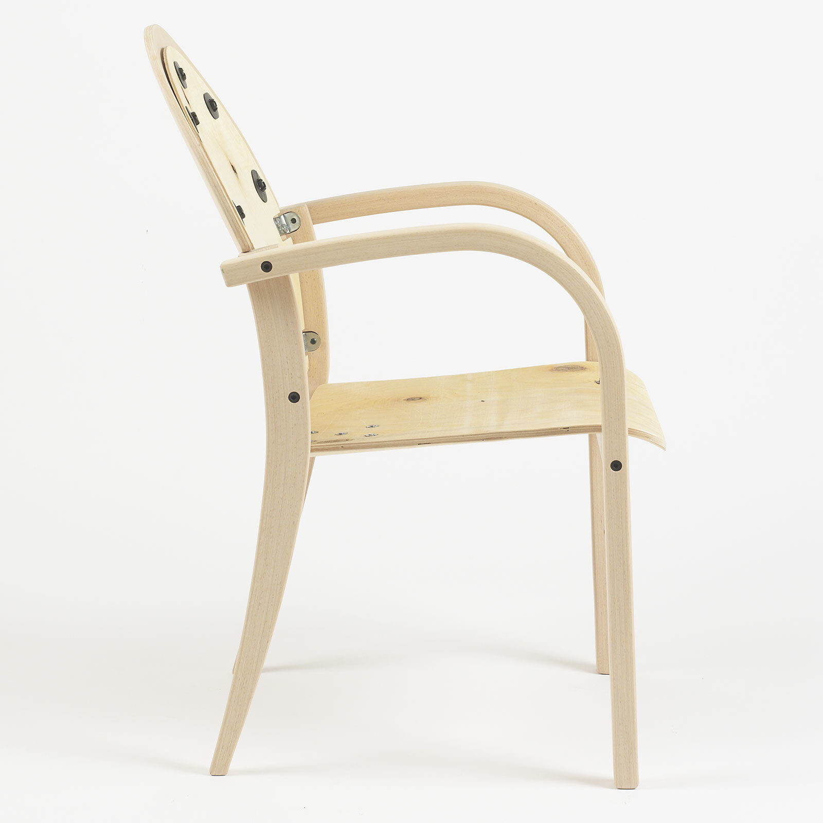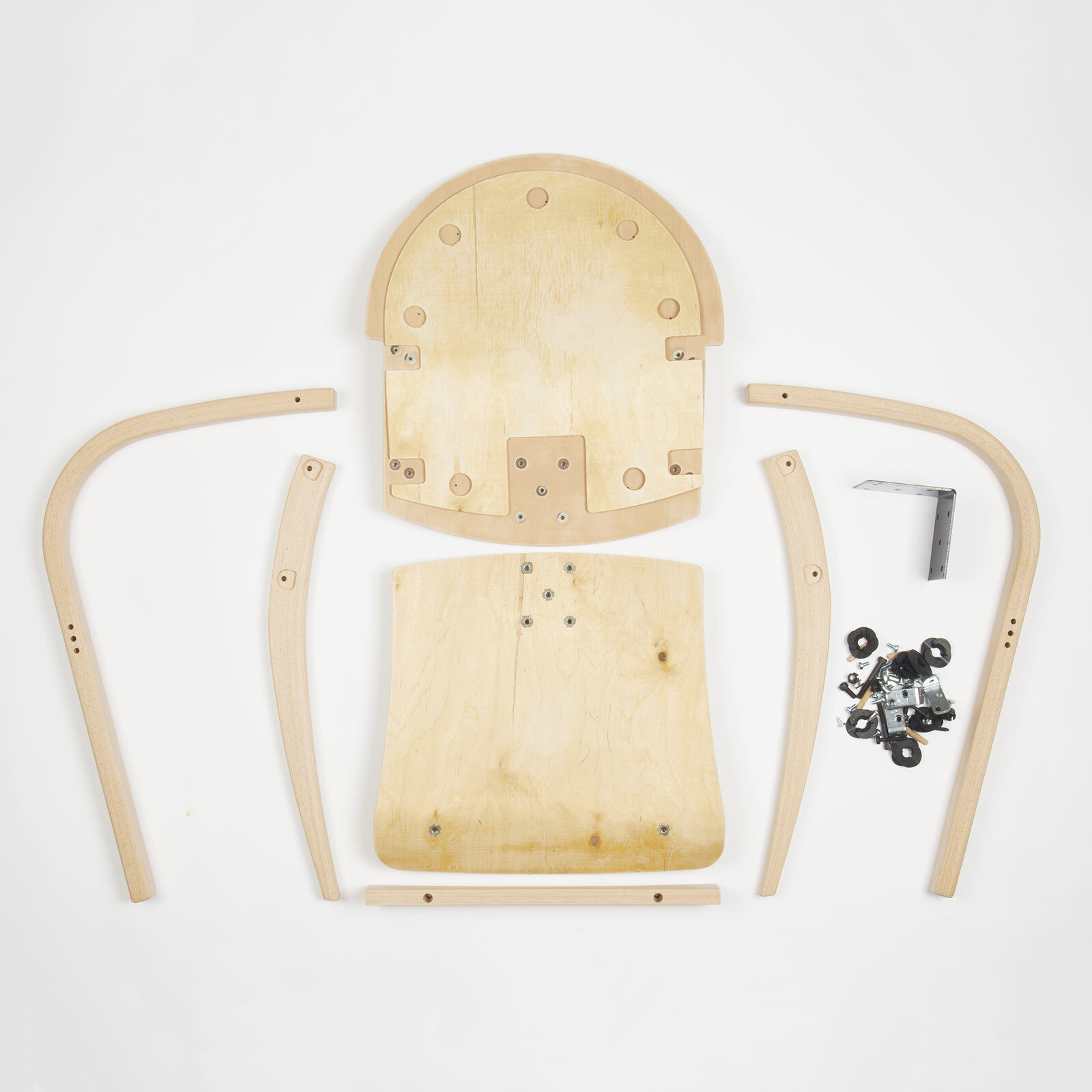 Rám kresla: Bukové lúpané dýhy dodávané buď brúsené alebo lakované.